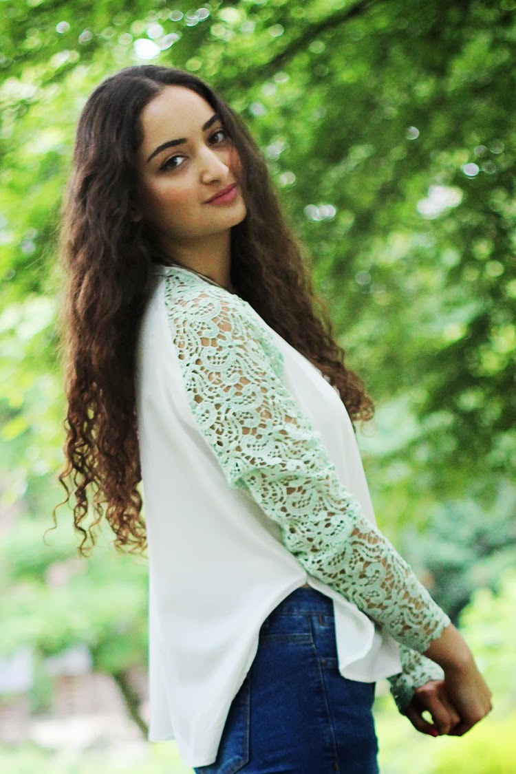 Kein einziges schwarzes Kleidungsstück! Gut, was? Ich bessere mich! Zudem ist das heutige Outfit so richtig simpel und alltagstauglich. Das Oberteil mit den Spitzenärmeln ist trotzdem etwas ganz Besonderes – ich find es richtig schön… Und da ich ja Jeanshosen liebe, musste ich es einfach mit einer Blue Jeans kombinieren. Besäße ich einen mintfarbenen oder rosanen Rock, hätte ich es eventuell auch damit kombiniert, aber ihr wisst ja… bei mir ist alles SCHWARZ! :D